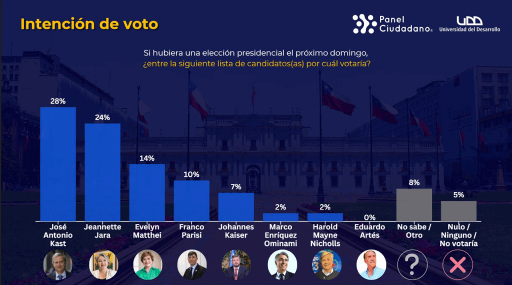 En medio de la carrera presidencial, un nuevo sondeo de Panel Ciudadano de la Universidad del Desarrollo (UDD) reveló que José Antonio Kast continúa liderando la intención de voto, mientras Jeannette Jara se mantiene en el segundo lugar con una ventaja de 10 puntos sobre Evelyn Matthei.