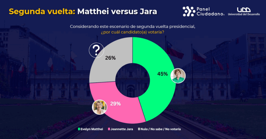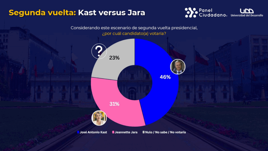 El sondeo también midió eventuales escenarios de balotaje. Frente a José Antonio Kast, Jara obtiene un 31%, muy por debajo del 46% del republicano, mientras un 23% se muestra indeciso o votaría nulo.