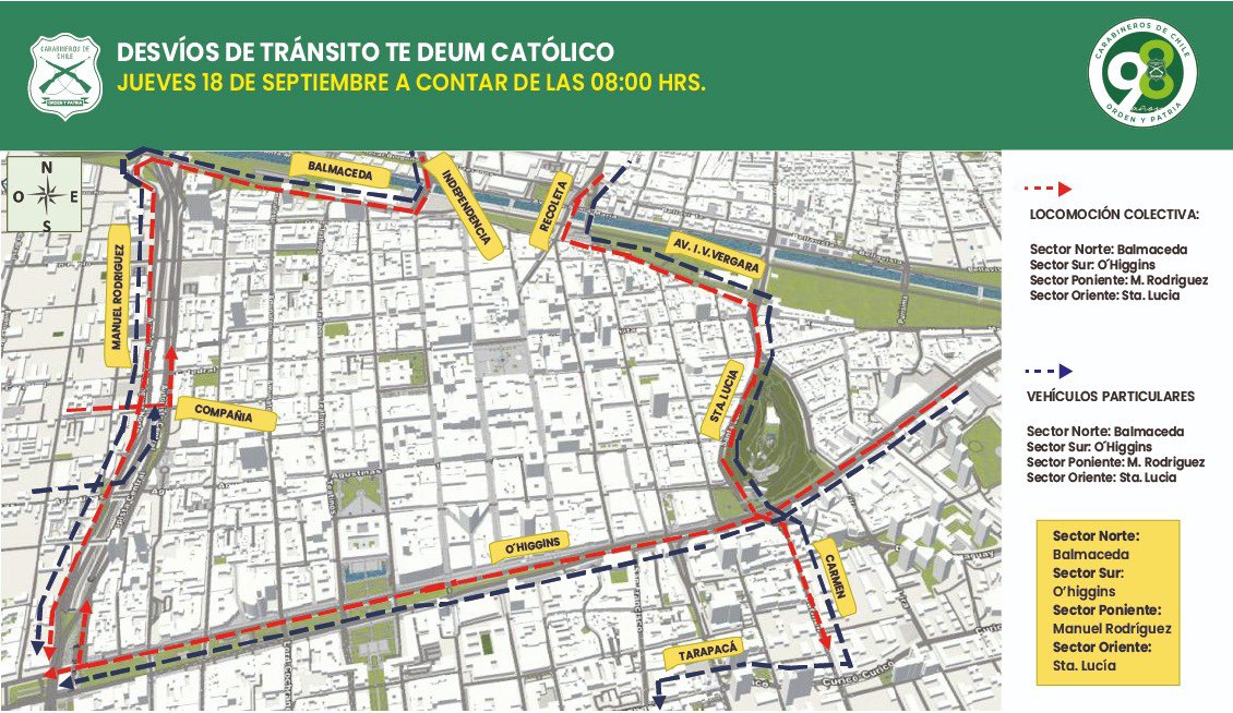 El Te Deum Ecuménico se realizará el 18 de septiembre a las 11:00 horas en la Catedral y desde las 08:00 horas se implementará un perímetro de seguridad que abarca desde calle El Carmen hasta Manuel Rodríguez, bordeando el cerro Santa Lucía y la Alameda. Los desvíos son: