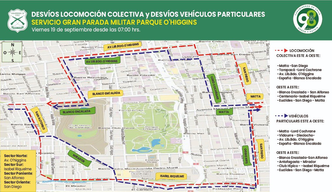 El 19 de septiembre, la tradicional Parada Militar en el Parque O’Higgins también tendrá un plan de desvíos. Los cortes se aplicarán desde las 07:00 horas en el perímetro que abarca Parque O’Higgins y Club Hípico.