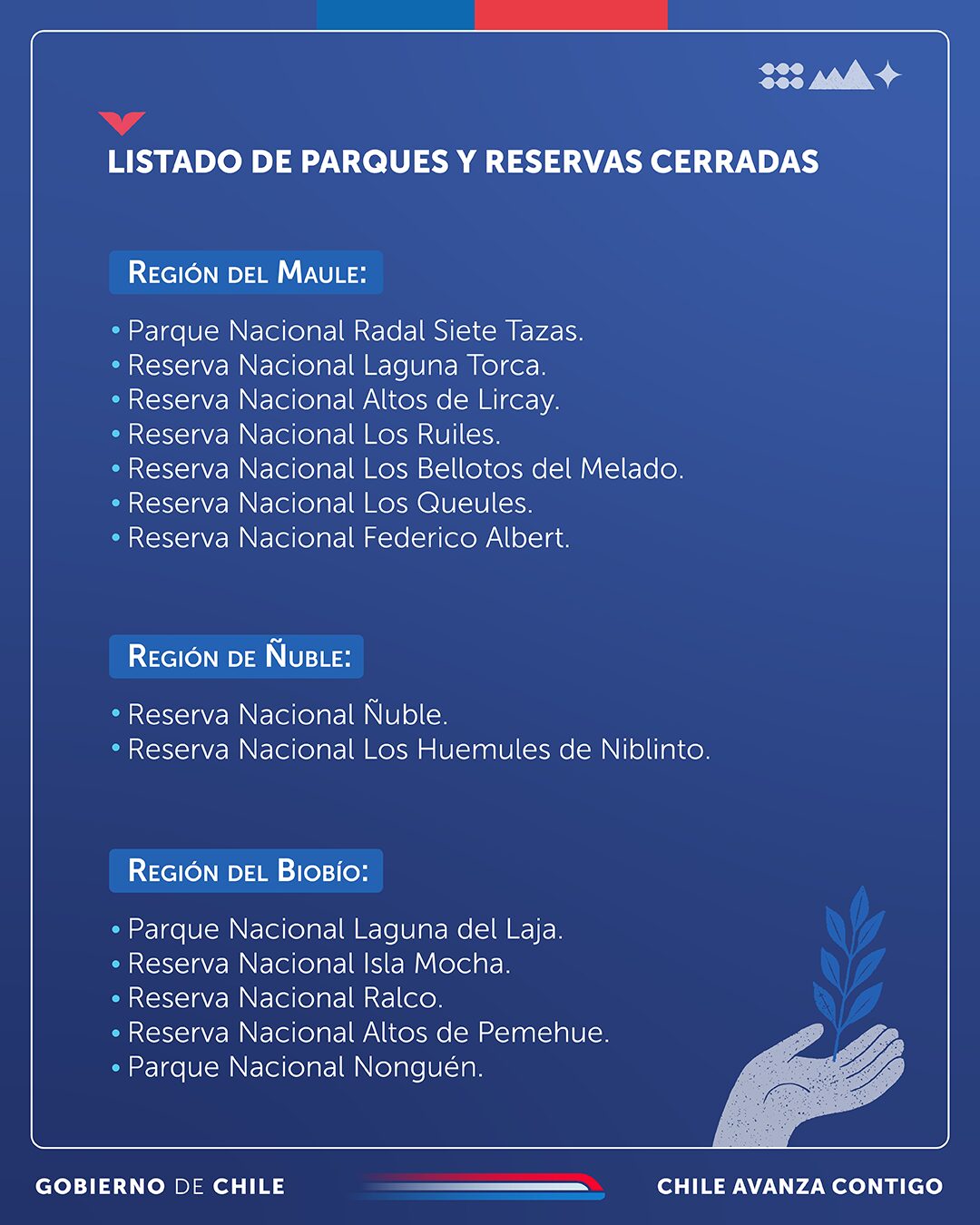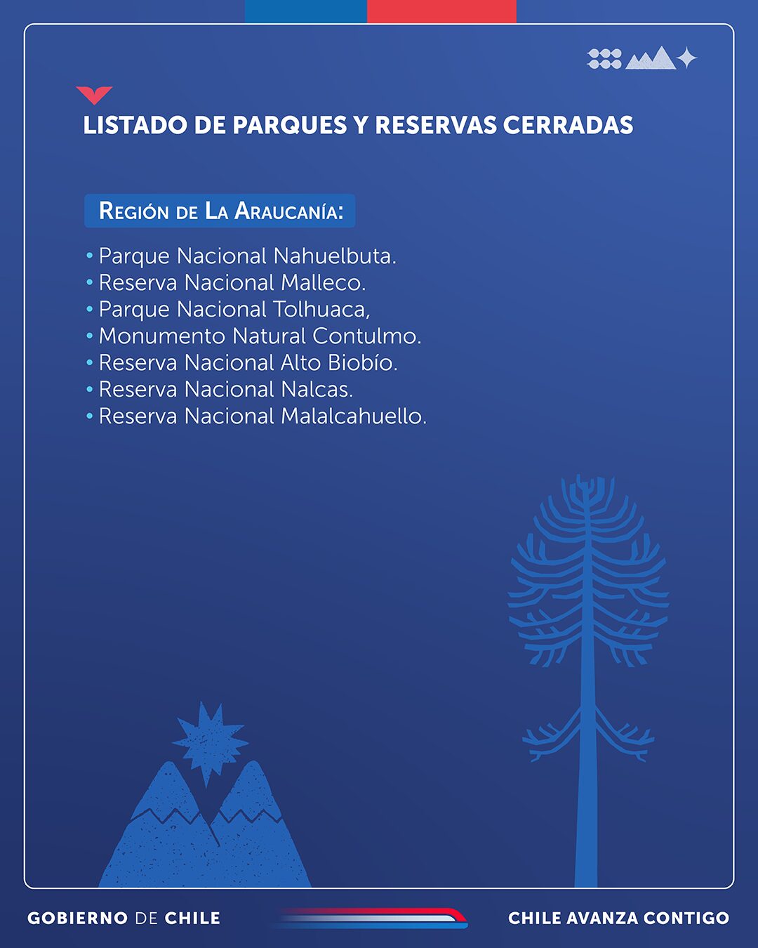 “Se vienen días difíciles, en algunas áreas se puede llegar a 40 grados de temperatura. Por lo mismo, con la directora de Conaf hemos decidido cerrar, este fin de semana, nuestros parques y reservas nacionales entre las regiones de Valparaíso y la provincia de Malleco, en el caso de la Región de La Araucanía”, explicó el ministro de Agricultura, Esteban Valenzuela.