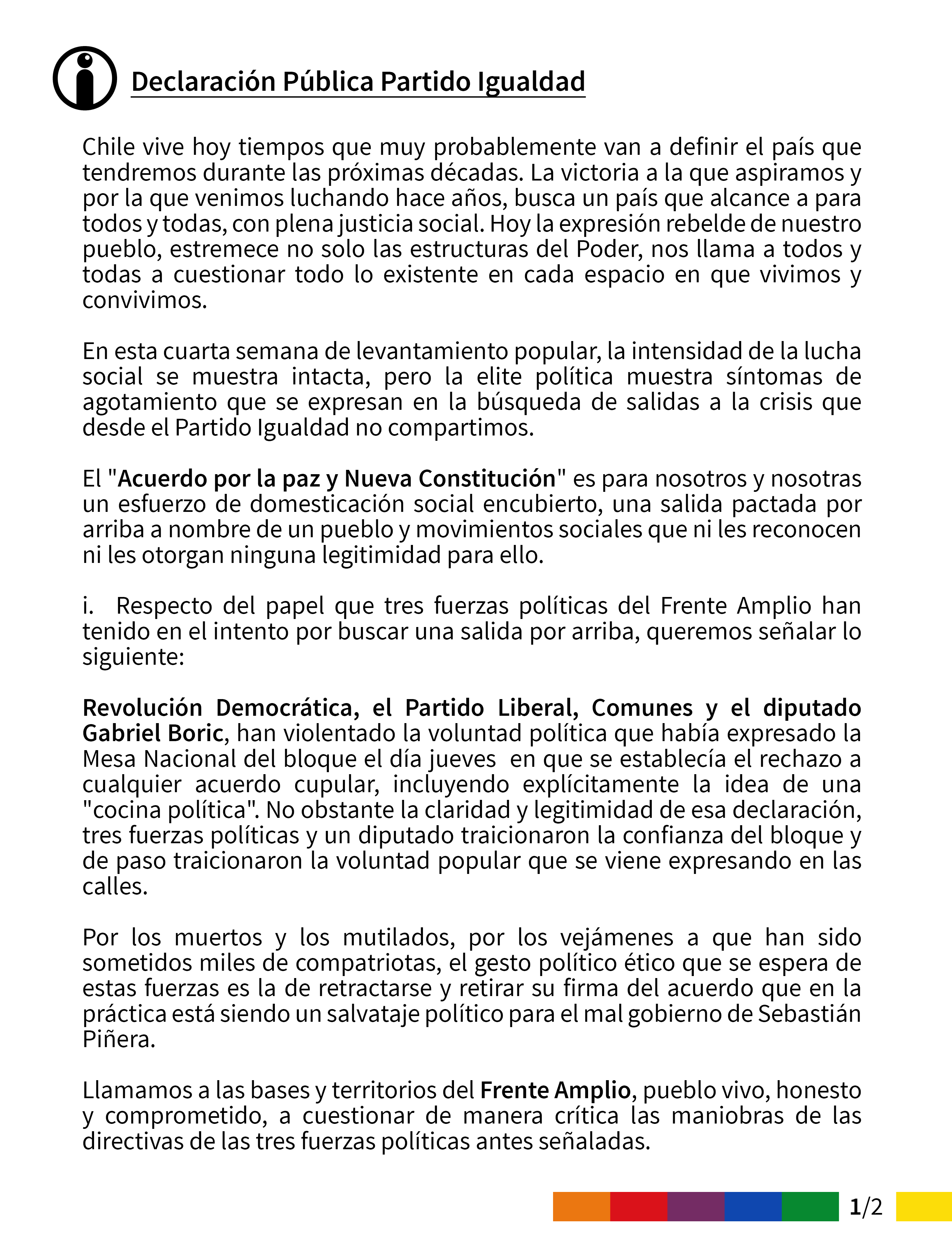 A través de una declaración pública, la agrupación declara que “la élite política muestra síntomas de agotamiento que se expresan en la búsqueda de salidas a la crisis que desde el Partido Igualdad no compartimos”.