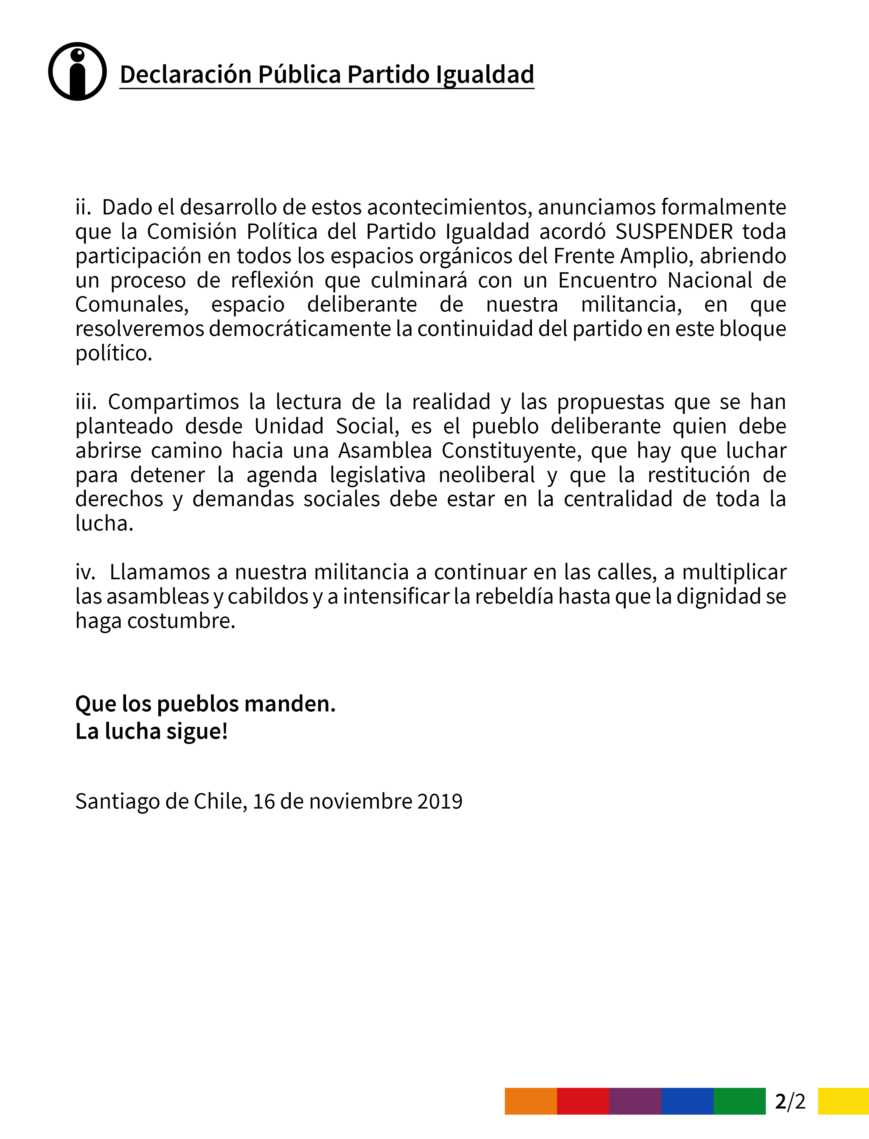 Finalmente, el partido informa que resolverá democráticamente la continuidad del partido en el bloque político a través de la realización de un “Encuentro Nacional de Comunales”.