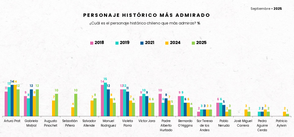 El primer lugar fue compartido por dos figuras emblemáticas: Arturo Prat y Gabriela Mistral, ambos con un 12% de las menciones.