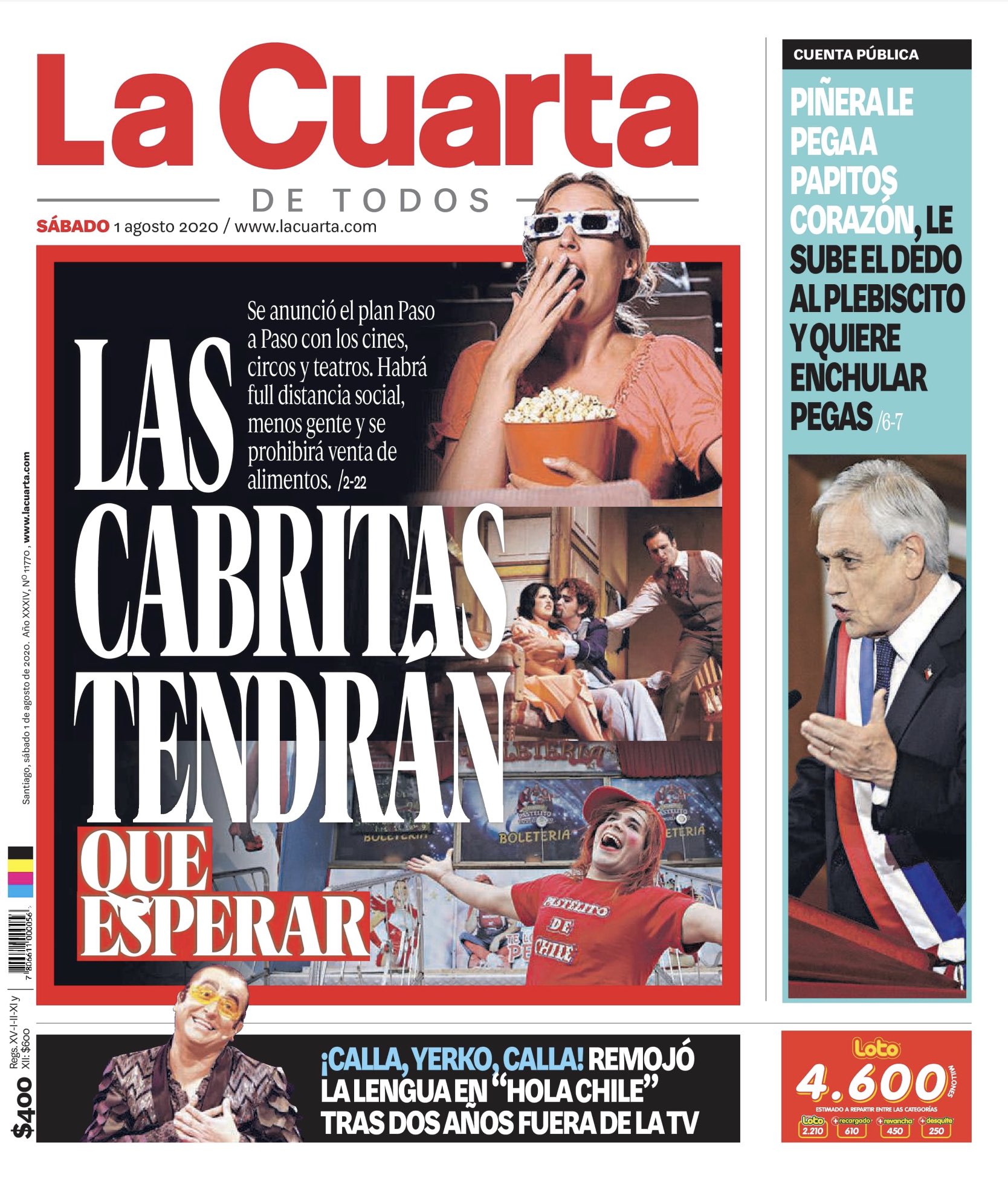 En un mayor espacio, resaltó el Plan Paso a Paso en cines, teatros y circos, que se caracterizará por la distancia social entre los asistentes, menos circulación y la prohibición temporal de la venta de alimentos. “Las cabritas tendrán que esperar”, tituló.