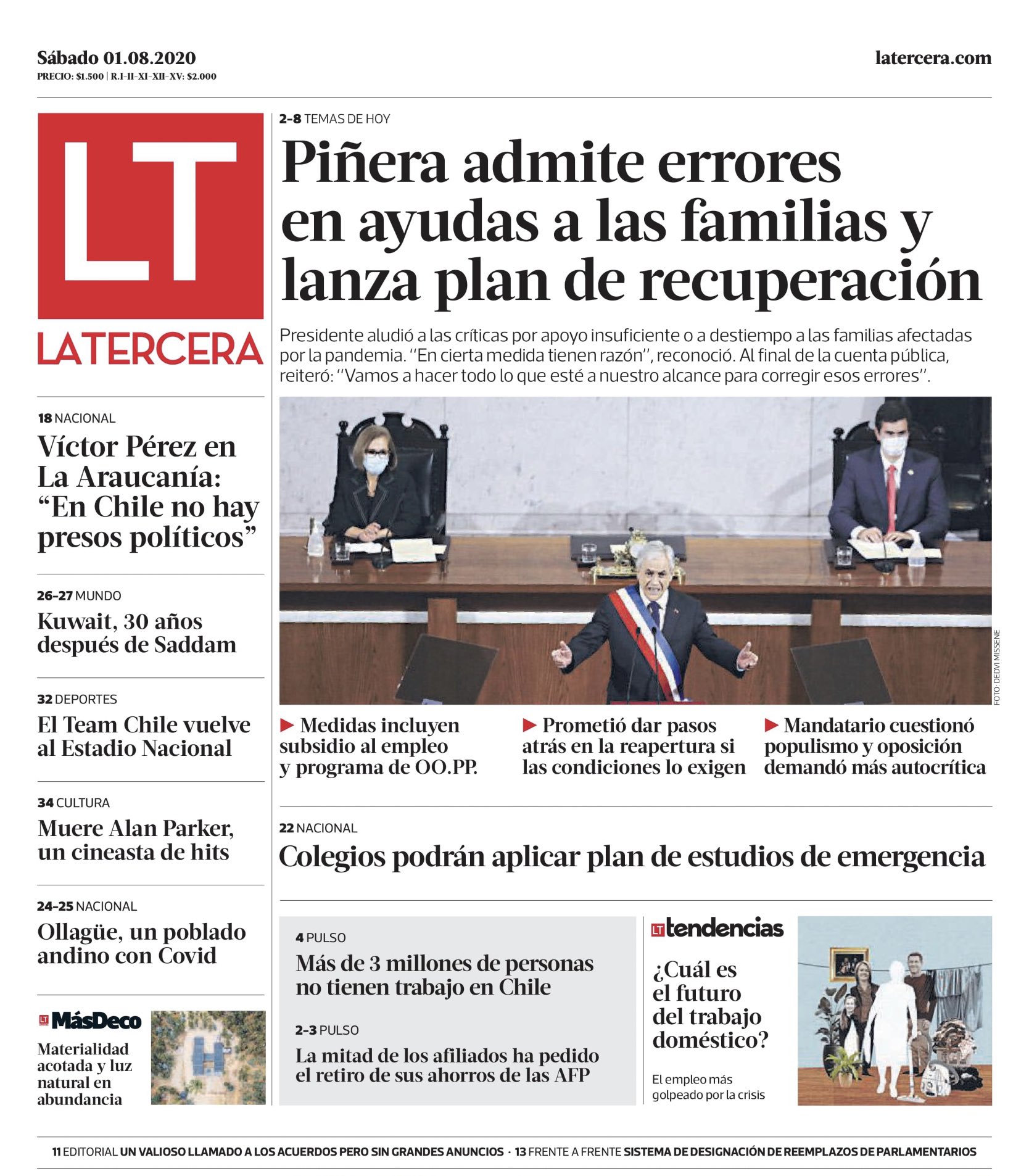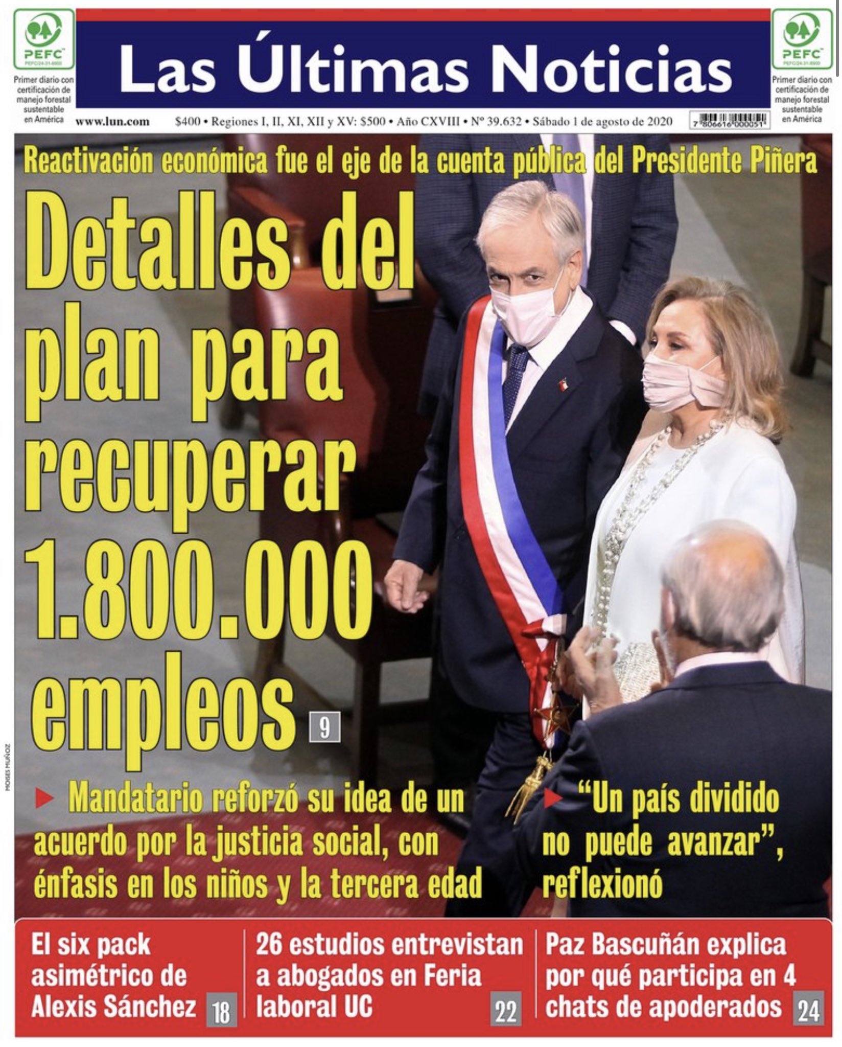 Las Últimas Noticias en tanto, con sus clásicas letras amarillas destacó el plan de recuperación anunciado por Piñera, que pretende rescatar 1,8 millones de empleos.