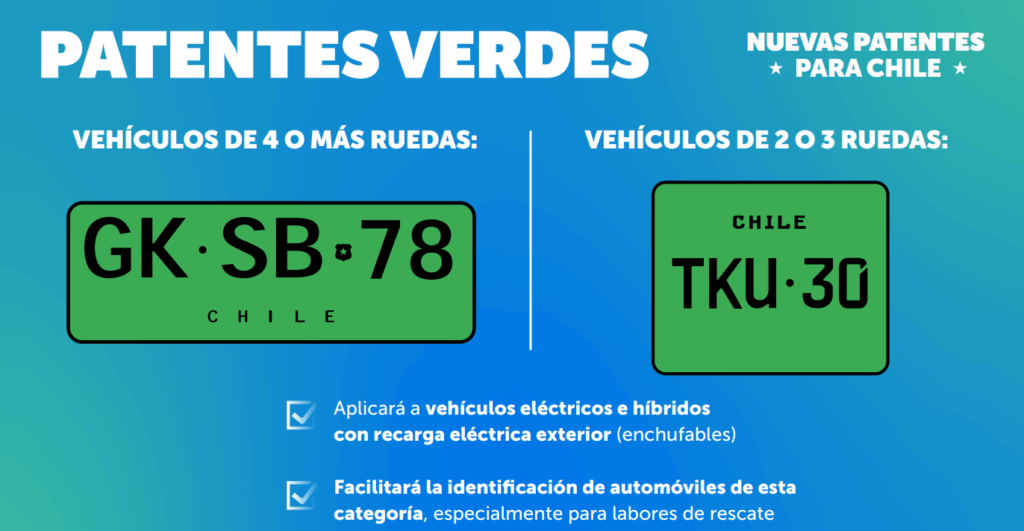 - La patente verde identificará a todos los vehículos eléctricos o híbridos enchufables del país, medida que busca facilitar la identificación y rescate de estos vehículos en caso de emergencia, siguiendo recomendaciones de Bomberos de Chile y de la industria automotriz.