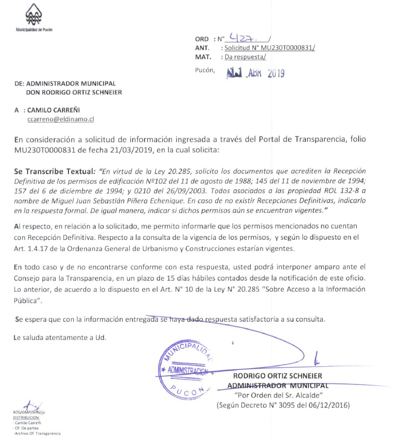 Según pudo comprobar El Dínamo, mediante la Dirección de Obras Municipales de Pucón (DOM), el terreno de 200.000 m2 ha accedido a cuatro permisos de edificación otorgados a nombre de Sebastián Piñera.