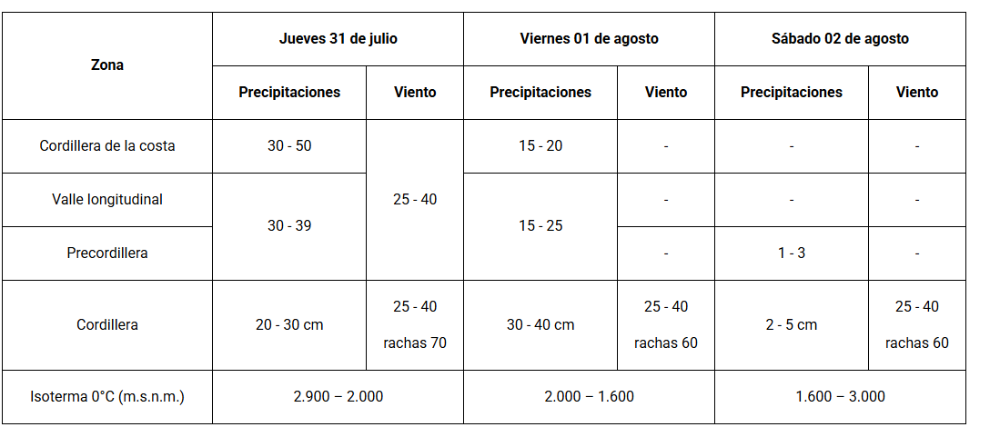 - Precipitaciones moderadas a fuertes con isoterma cero alta en cordillera de la costa (hasta el 1 de agosto).