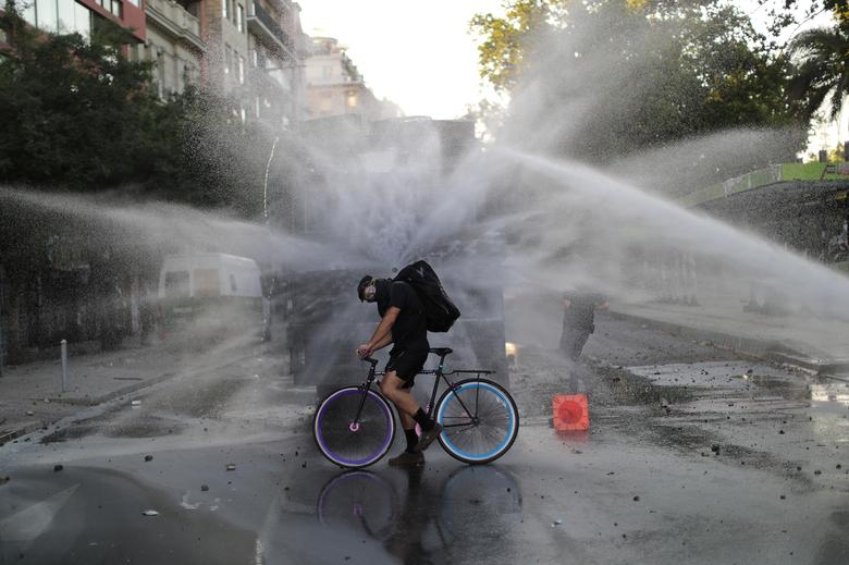 Un hombre en bicicleta es rociado por un cañón de agua durante una protesta contra el gobierno de Chile en Santiago, Chile, 5 de diciembre de 2019. REUTERS / Pablo Sanhueza