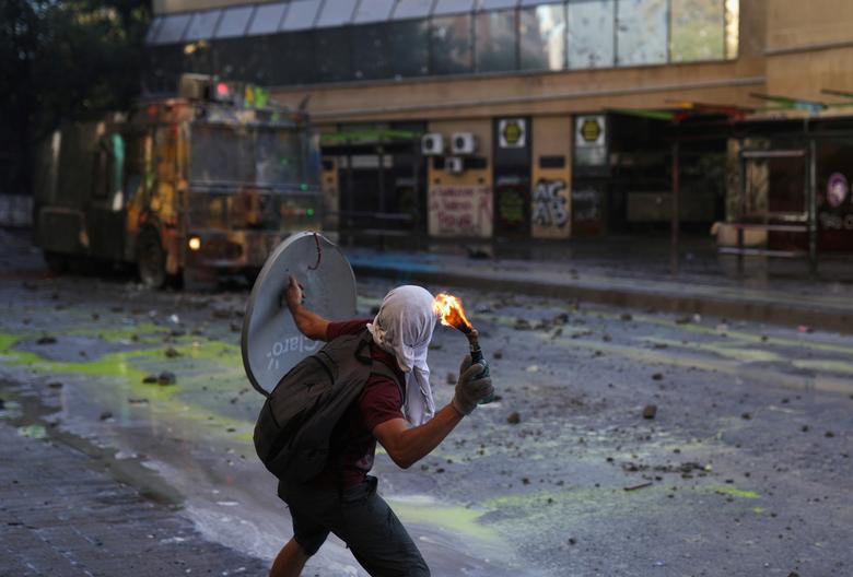 Un manifestante arroja una bomba de gasolina contra un vehículo de la policía antidisturbios durante una protesta contra el gobierno de Chile, en Santiago de Chile, 29 de noviembre de 2019. REUTERS / Pablo Sanhueza