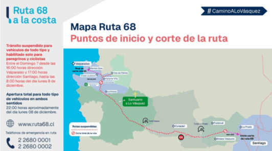 El cierre total de la Ruta 68 se extenderá hasta aproximadamente las 08:00 horas del lunes 8 de diciembre. Desde ese momento se habilitará una apertura parcial solo para vehículos motorizados y solo hasta las cercanías del Santuario, con tránsito restringido tanto en la Región Metropolitana como en Valparaíso.
