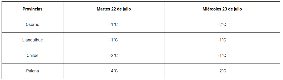 El fenómeno se desarrollará entre este martes 22 y miércoles 23 de julio, afectando especialmente a las comunas de Osorno, Llanquihue, Chiloé y Palena.