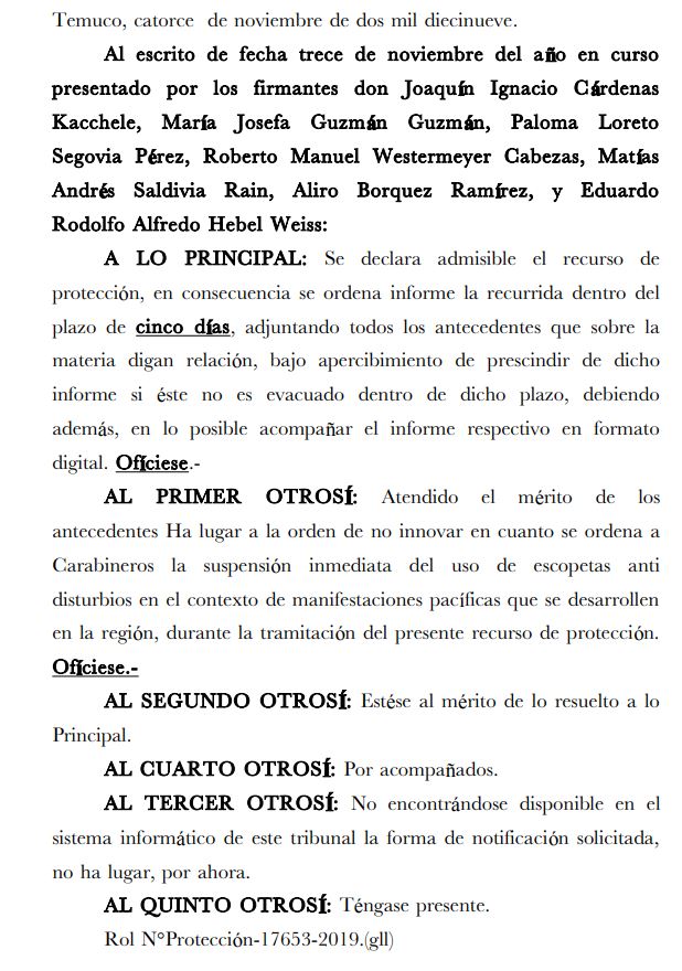 “Ha lugar a la orden de no innovar en cuanto se ordena a Carabineros la suspensión inmediata del uso de escopetas antidisturbios en el contexto de manifestaciones pacíficas que se desarrollen en la región”, dice parte del escrito.