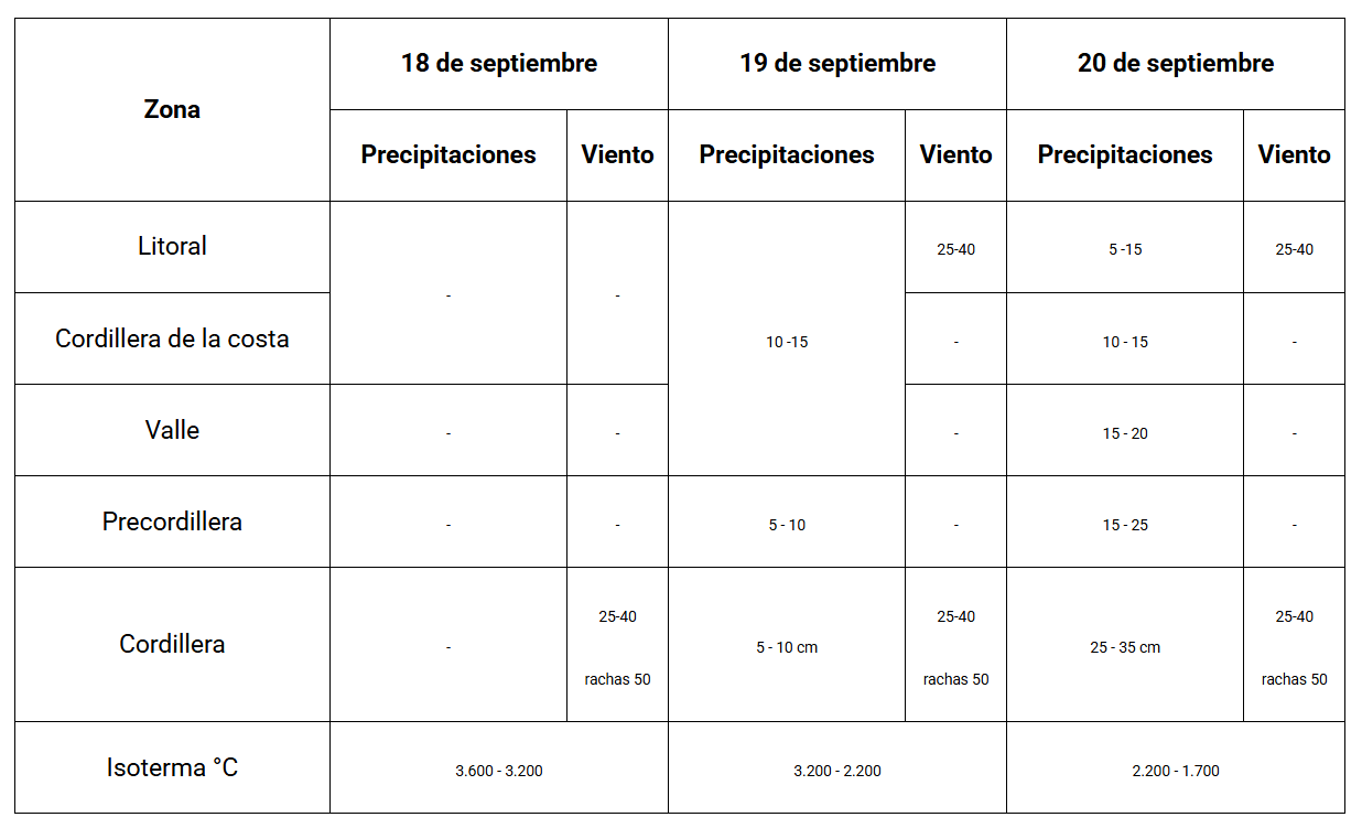 En concreto, hay un aviso por precipitaciones normales a moderadas especialmente en la precordillera de la región durante el 19 y 20 de septiembre.