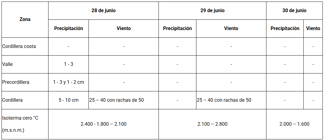 En concreto, detallaron que se trata de heladas normales a moderadas con probabilidad de formación de escarcha en la cordillera, cordillera costa, valle y precordillera (entre -4 y -1 C°). A ello se suman posibles precipitaciones y viento.