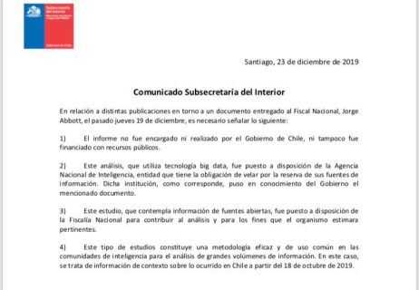 Tras la diversas críticas que ha recibido el escrito, la Subsecretaría del Interior emitió un comunicado aclarando -en primer lugar- que “el informe no fue encargado ni realizado por el Gobierno de Chile, ni tampoco fue financiado por recursos públicos”.