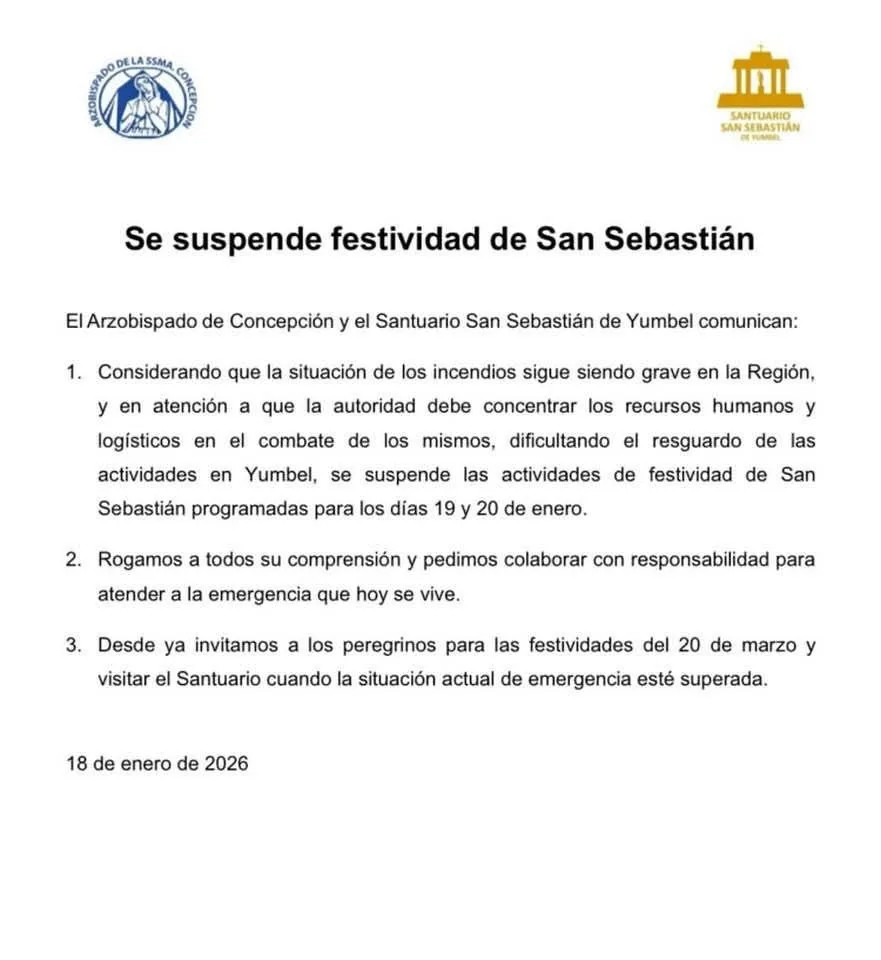 La festividad de San Sebastián en Yumbel no se realizará este año en las fechas tradicionales. El Arzobispado de Concepción y el Santuario de San Sebastián informaron la suspensión de todas las actividades programadas para el 19 y 20 de enero, ante la emergencia por incendios forestales que afecta a la zona centro-sur, con impacto especialmente en Ñuble y Biobío.