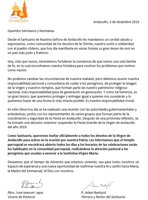 Como cada 23 de diciembre se realizaría la tradicional Fiesta Grande de la Virgen de Andacollo, en la Región de Coquimbo, una de las actividades religiosas con mayor convocatoria del país. Sin embargo, luego de varias reuniones entre autoridades municipales, eclesiásticas e incluso directivas de bailes religiosos decidieron suspender la festividad.