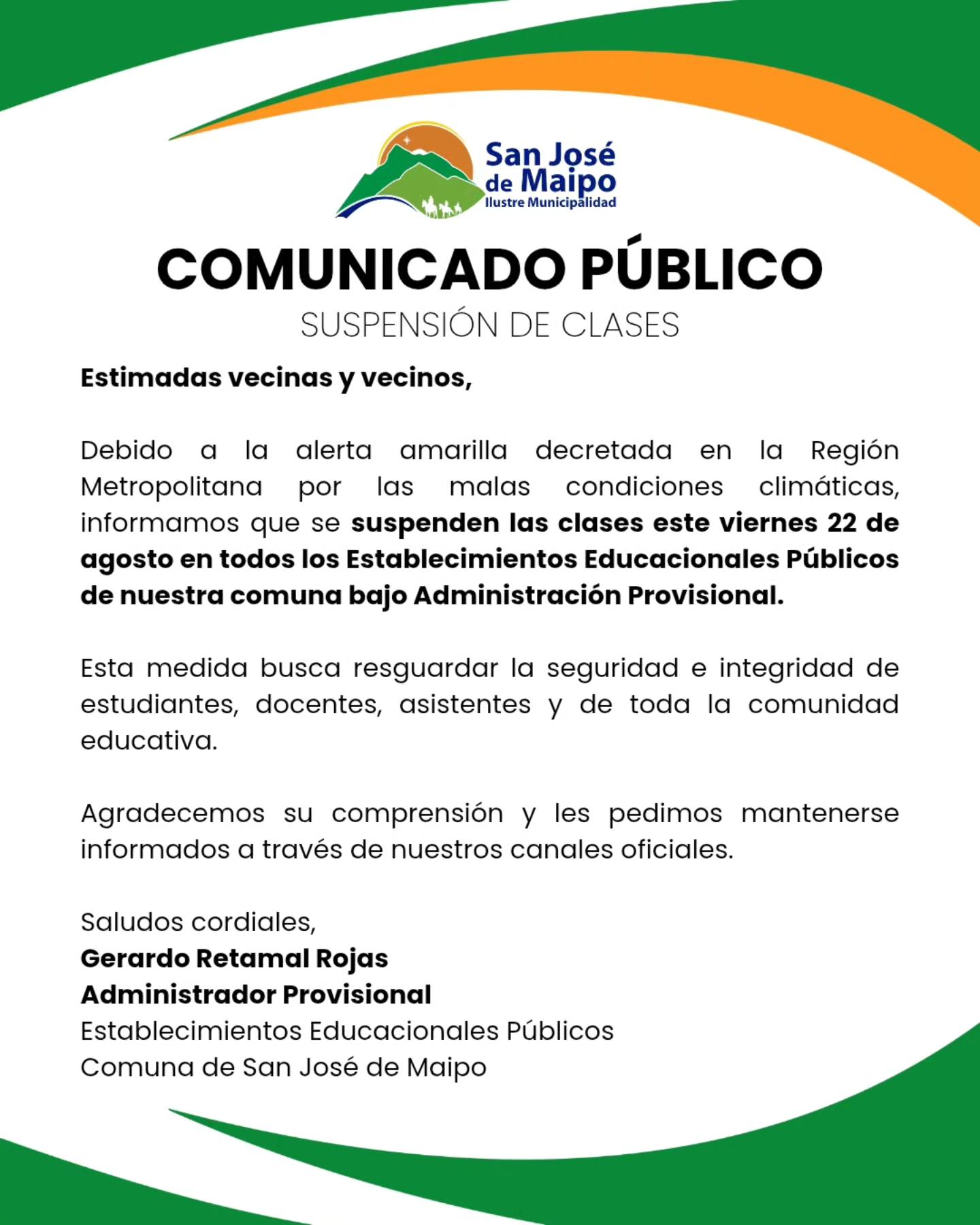 #Atención comunidad escolar de la @mpuentealto se suspenden las clases mañana viernes 22 de agosto 2025 por el sistema frontal. pic.twitter.com/GWsOqwBTwp