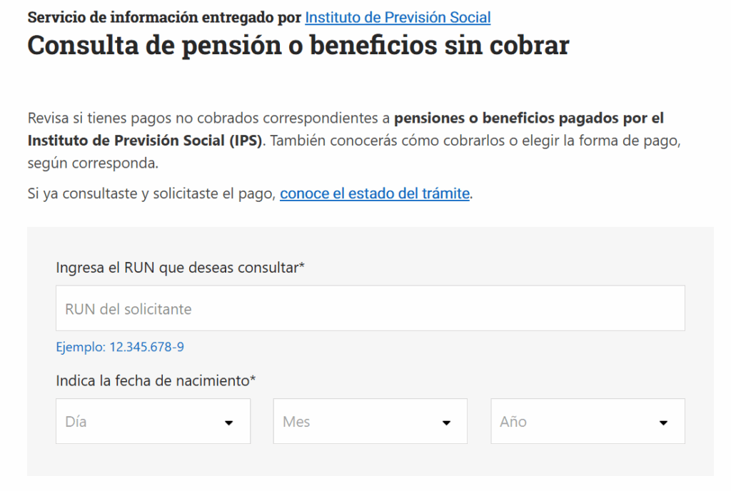 En el sitio se puede consultar por las pensiones y beneficios pagados por el IPS, como la Pensión Garantizada Universal (PGU), la Pensión Básica Solidaria de Invalidez (PBSI) y el Subsidio Familiar (SUF), entre otros.