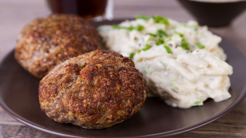 Frikadellen, el precursor de las hamburguesas, servido con ensalada de patatas. JanSommer/Adobe Stock.
