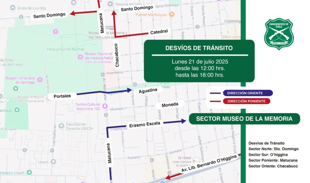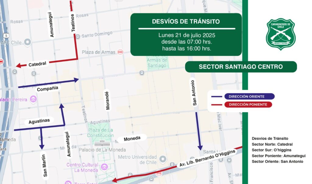 ⚠️ Desvíos de tránsito: En el marco de la “Reunión de Alto Nivel Democracia Siempre”, que se realizará el lunes 21 de julio y en la que participarán mandatarios de diversos países, se efectuarán desvíos de tránsito en el centro de #Santiago, entre las 07:00 y las 18:00 horas,… pic.twitter.com/LCuBOFJsUG