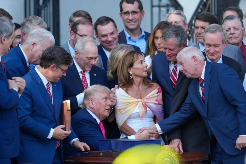El presidente Donald Trump, acompañado por legisladores republicanos, firma la ley “One, Big Beautiful Bill” en el jardín sur de la Casa Blanca, el 4 de julio. Eric Lee/Getty Images