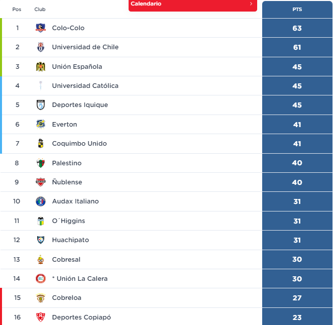 Colo Colo se mantiene en la cima del campeonato nacional con 63 puntos, seguido de cerca por Universidad de Chile, que acumula 61 puntos.