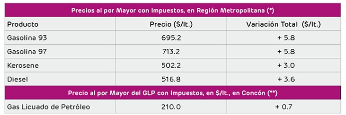 La gasolina de 93 y 97 octanos, subirán 5,8 pesos por litro. El kerosene lo hará en 3 pesos y el Diesel 3,6.