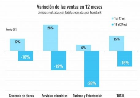 Hasta el 17 de octubre, las ventas realizadas con tarjetas bancarias aumentaron un 12% en el comercio de bienes, 26% en servicios y 6% en turismo y entretención (todas en 12 meses); posteriormente, entre el 18 y el 27 de octubre cayeron un 10% en bienes, 19% en servicios y 36% en turismo.