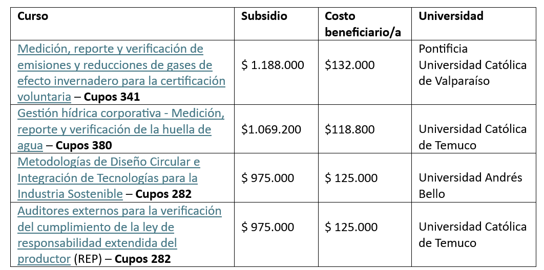 Estas capacitaciones están dirigidas a profesionales y técnicos de todo Chile, y se dictarán en modalidad e-learning a través de diplomados en Ley REP, diseño circular, gestión hídrica y auditoría de gases de efecto invernadero.