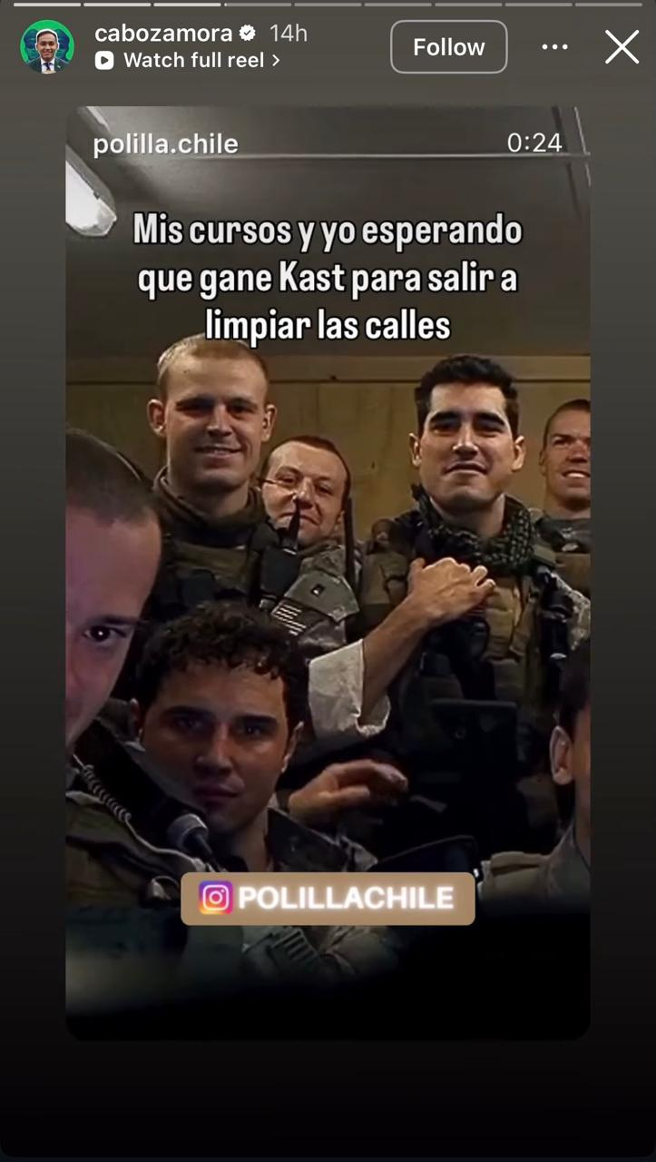 La publicación, originalmente un contenido conjunto de las cuentas polilla.chile y republikastdechile, consistía en un recorte de la película Warfare donde se veía a hombres con vestimenta militar portando armas, bajo el texto: “Mis cursos y yo esperando que gane Kast para salir a limpiar las calles”.