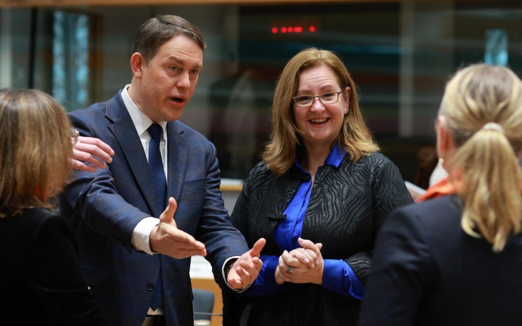 El viceministro polaco de Desarrollo Económico y Tecnología, Michal Baranowski (izq.), y la ministra neerlandesa de Comercio Exterior y Desarrollo, Aukje de Vries (der.), en el Consejo Europeo de Ministros de Comercio. EFE/EPA/OLIVIER HOSLET.