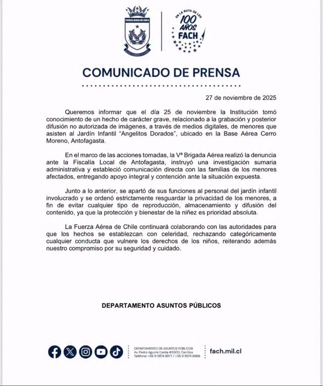Asimismo, detallaron que la Vª Brigada Aérea presentó una denuncia ante la Fiscalía Local de Antofagasta, instruyó una investigación sumaria administrativa y “estableció comunicación directa con las familias de los menores afectados, entregando apoyo integral y contención ante la situación expuesta”.