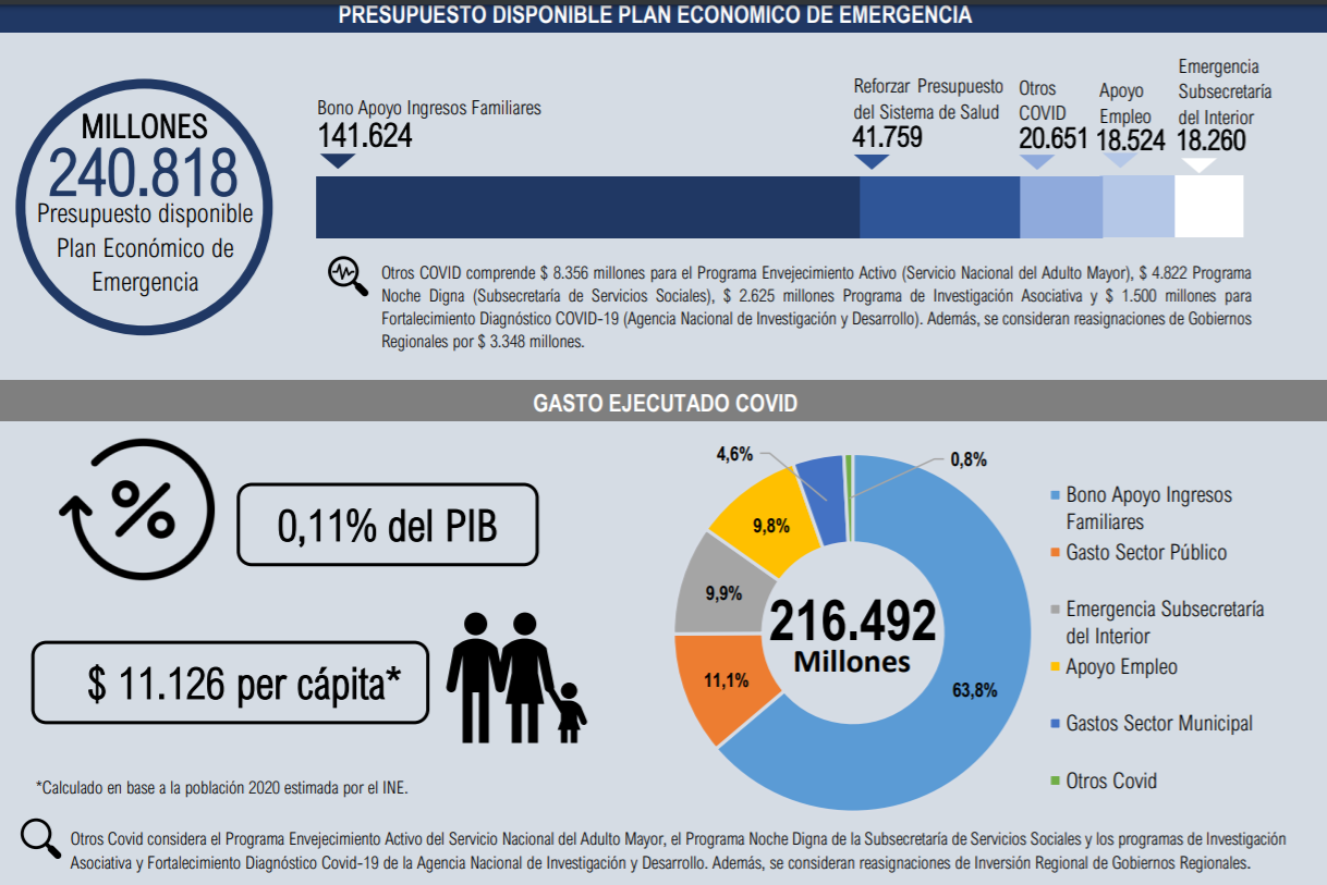 En el informe titulado “Financiamiento y gastos del Estado de Chile a raíz de la pandemia del coronavirus”, la entidad revela que la cifra representa un 0,11% del PIB y el monto per cápita de $11.126, calculado con respecto a la población estimada del 2020 según el INE.