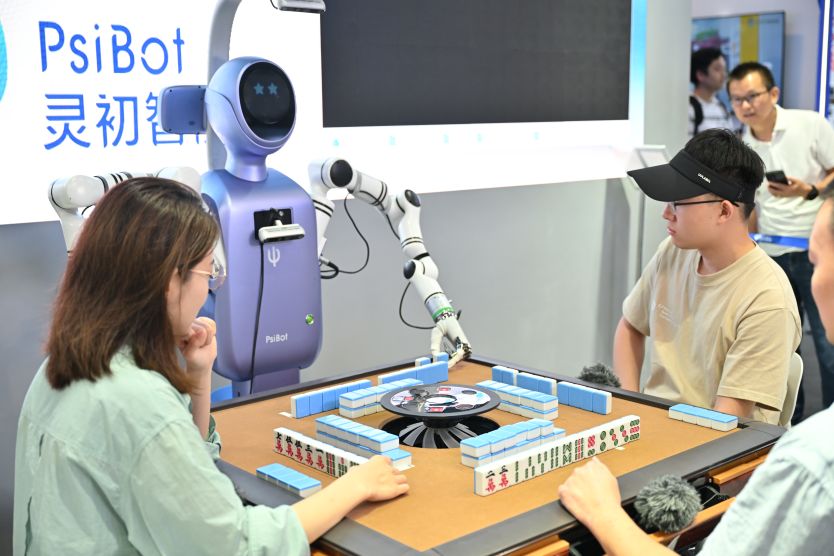 Un robot PsiBot juega mahjong durante la Conferencia Mundial de IA de 2025 (WAIC) y la Reunión de Alto Nivel sobre Gobernanza Global de IA en el Centro de Exposiciones y Convenciones de la Expo Mundial de Shanghái, en Shanghái, el 27 de julio de 2025. VCG/Getty Images.