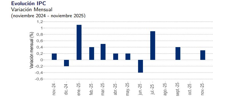 El Instituto Nacional de Estadísticas (INE) reveló este viernes que el Índice de Precio al Consumidor (IPC) de noviembre del 2025 anotó una variación mensual de 0,3%.