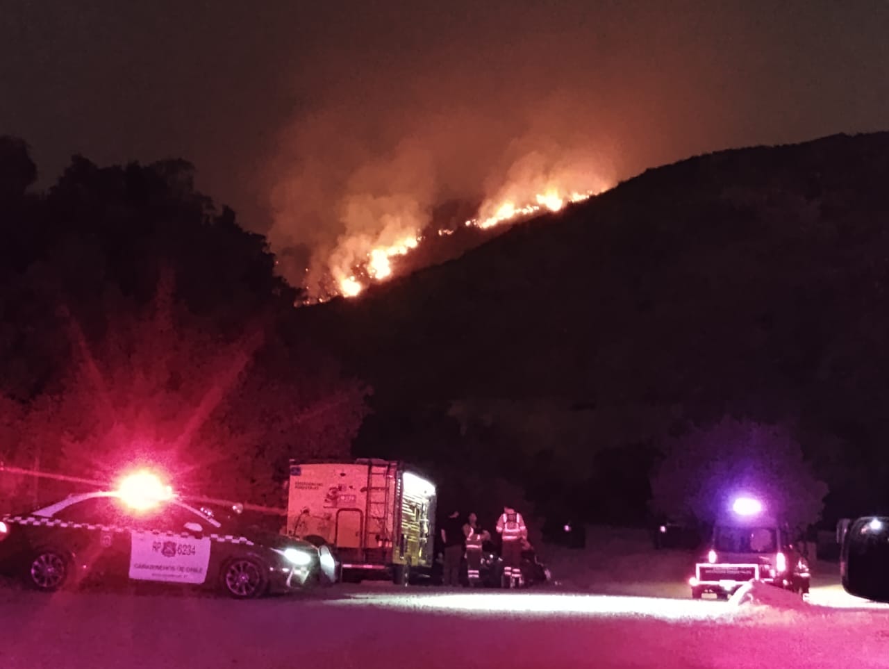 En el lugar trabajan al menos 14 máquinas de Bomberos, además de camionetas y vehículos de apoyo, con el objetivo de contener el avance de las llamas en una zona de difícil acceso.