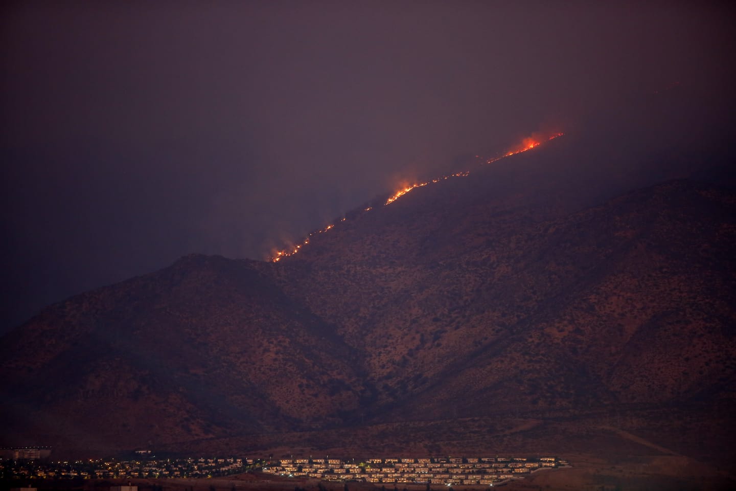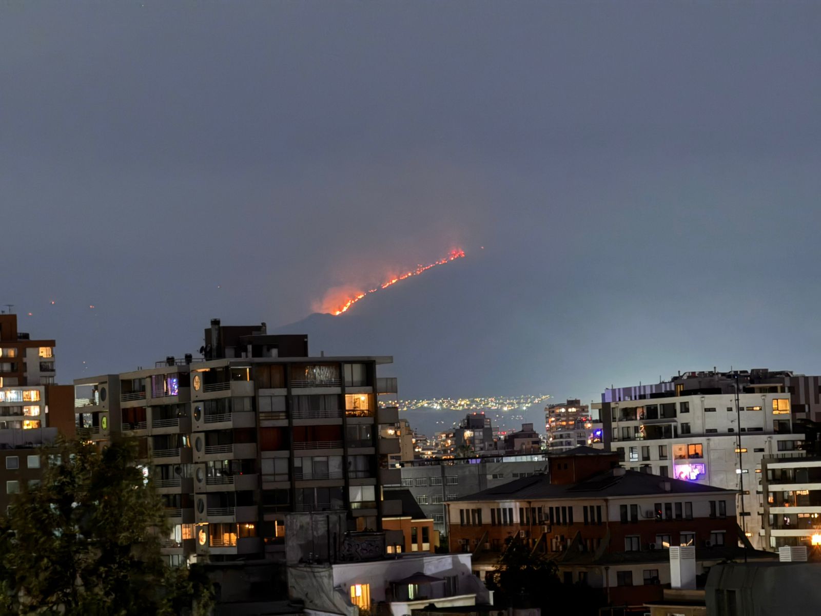 29 de diciembre de 2025/PROVIDENCIA Vista nocturna desde la comuna de Providencia al incendio forestal que afecta al sector precordillerano de San Carlos de Apoquindo. FOTO: HANS SCOTT/AGENCIAUNO.