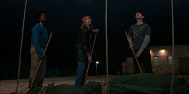 De izquierda a derecha: Caleb McLaughlin, Maya Hawke y Noah Schnapp en el “Volumen 2” de la temporada 5 de “Stranger Things”. Cortesía Netflix