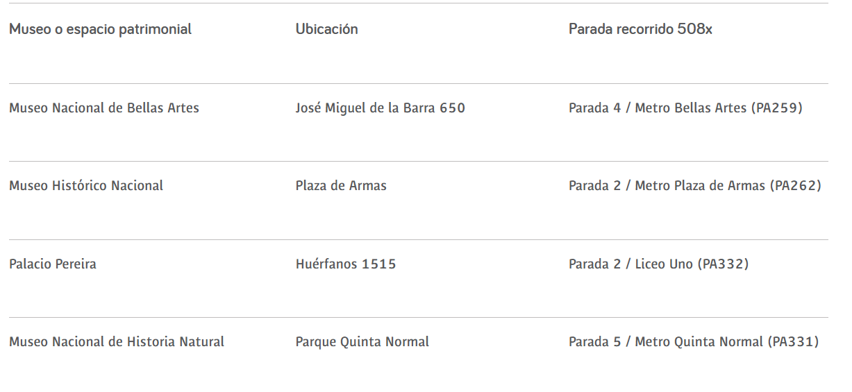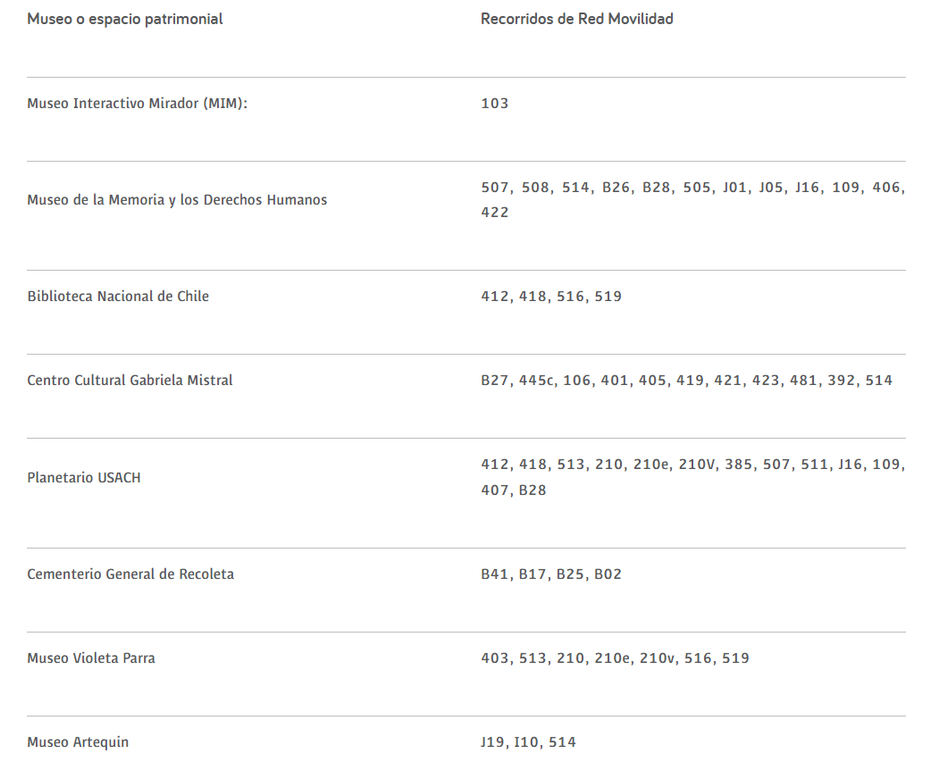 Por otro lado, Red Movilidad ofrece distintos recorridos de buses que llegan de manera habitual a los principales museos y espacios patrimoniales, tales como: