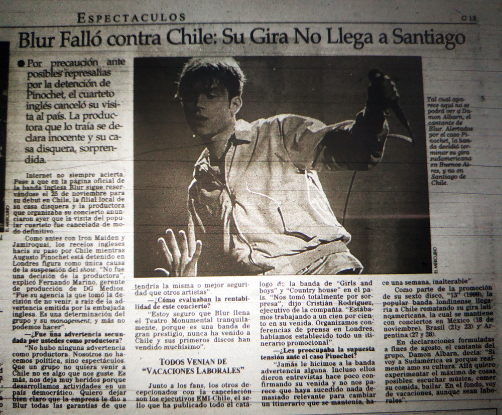 Algunas de las más reconocidas bandas británicas cancelaron conciertos en nuestro país por temor a posibles represalias de los partidarios del entonces senador vitalicio. “Recibimos una indicación para no visitar Chile”, dijo Damon Albarn, líder de Blur.