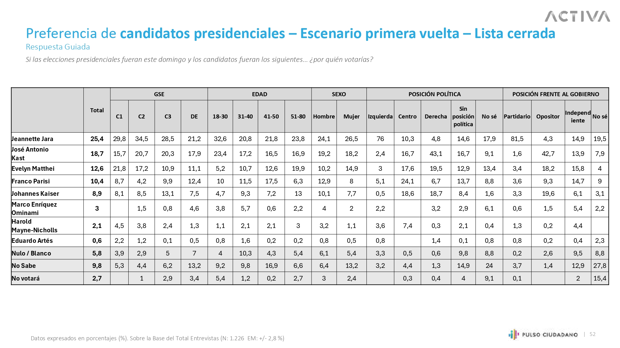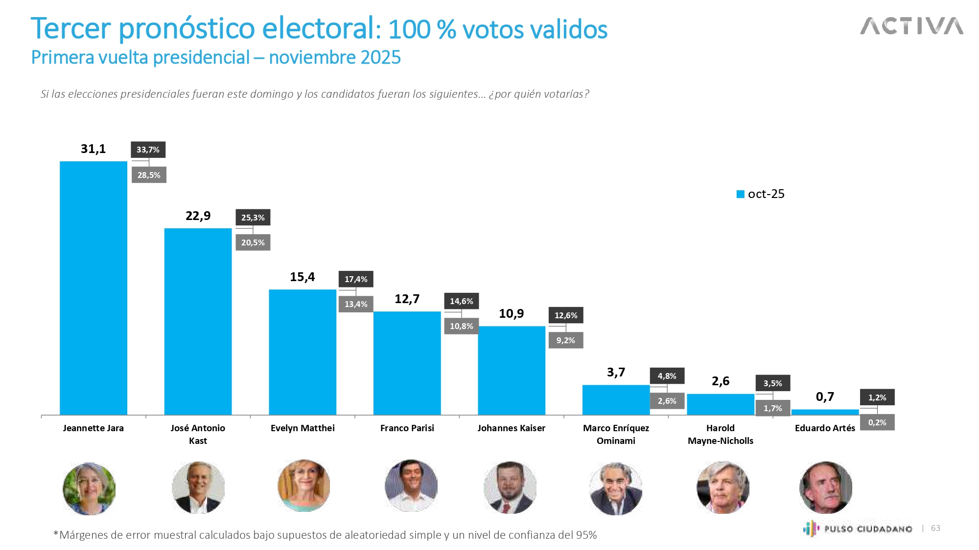 En esa línea, Cavieres proyectó que el escenario más probable es que los candidatos Jeannette Jara y José Antonio Kast pasen a segunda vuelta.