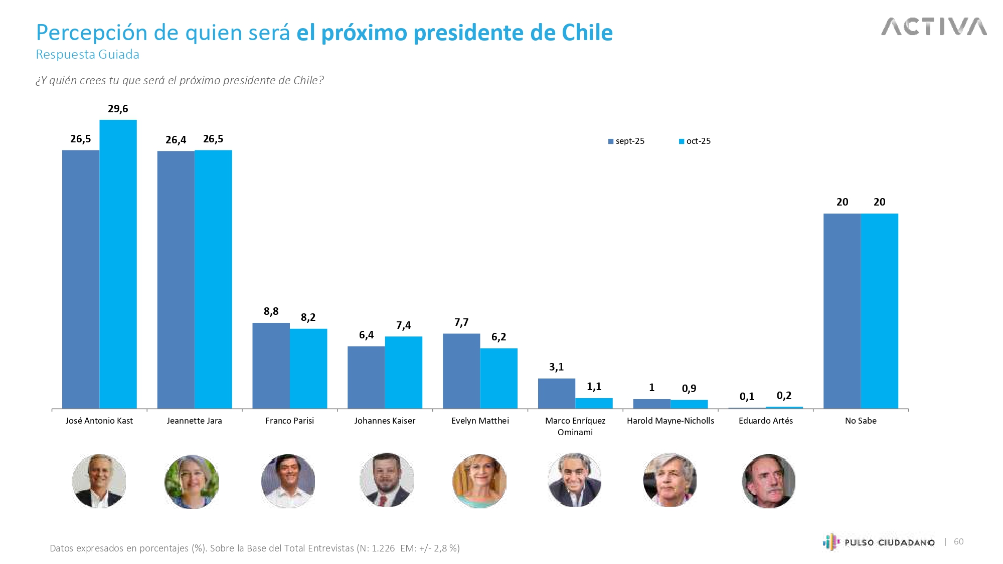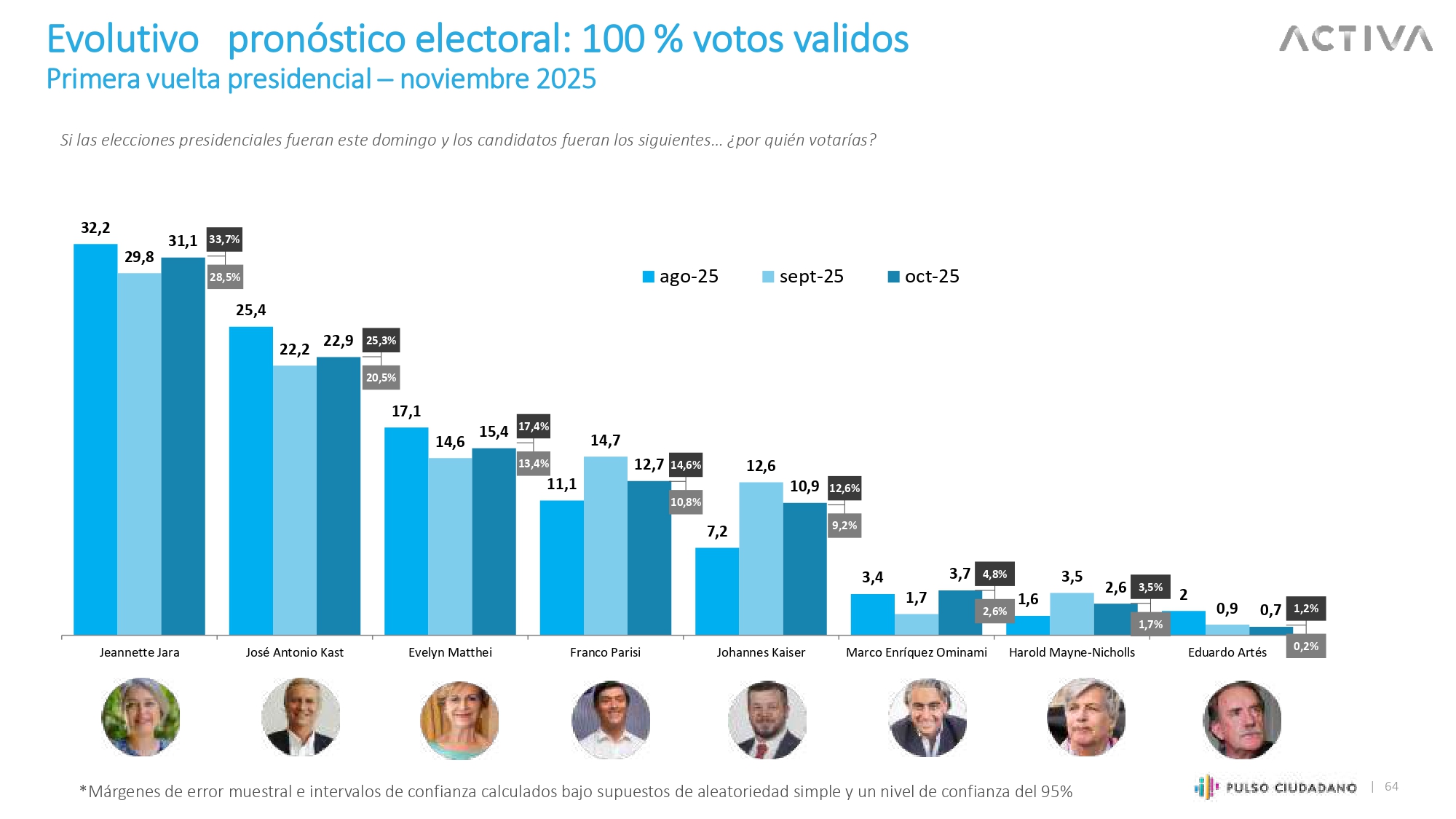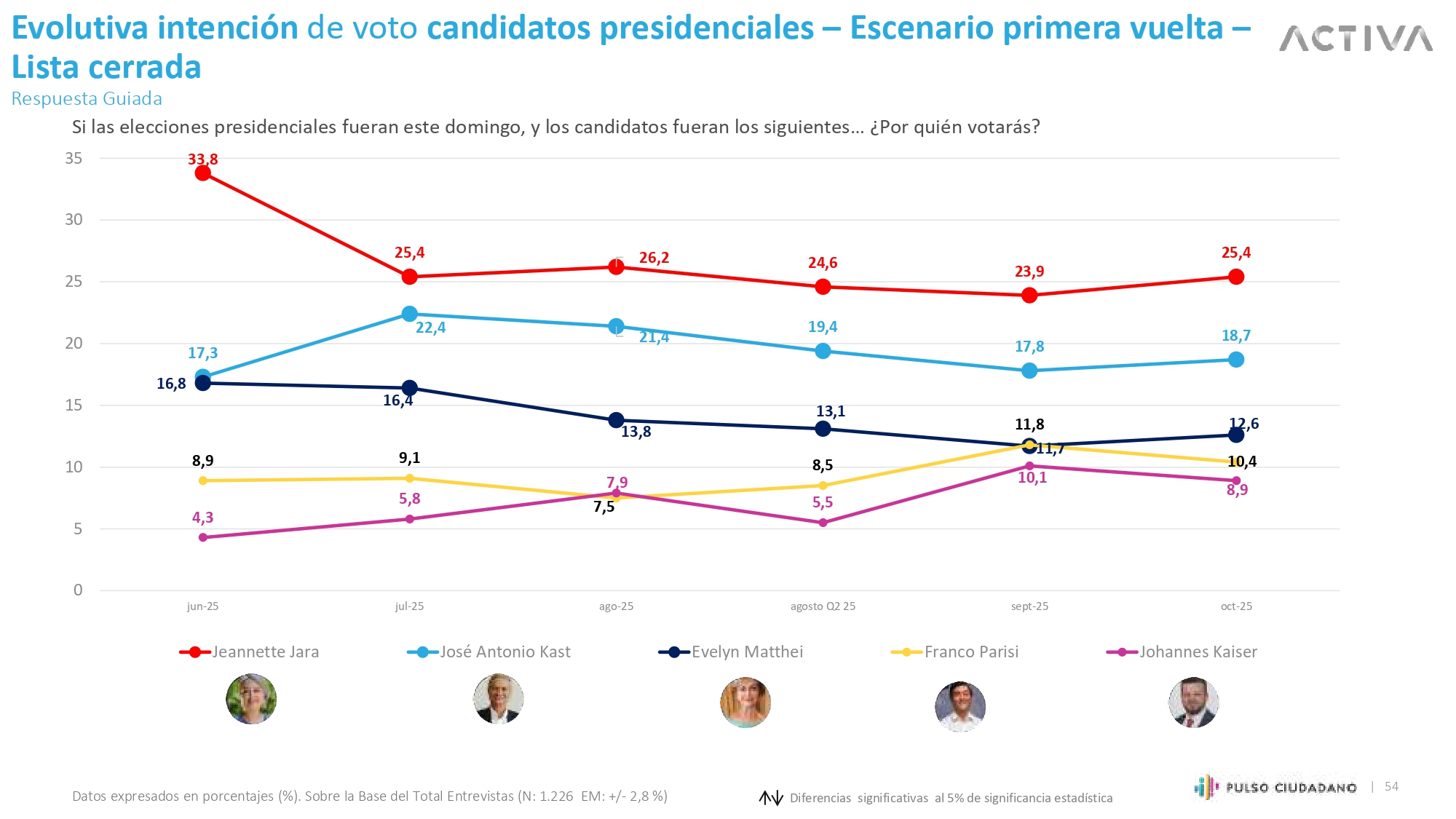 “Lo relevante es que hay tres candidatos que se están disputando el tercer lugar, quienes no presentan diferencia estadística en términos de representación”, sostuvo. Los abanderados serían Evelyn Matthei, Franco Parisi y Johannes Kaiser.