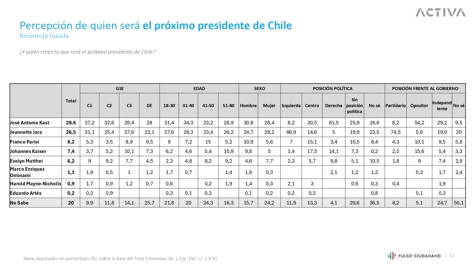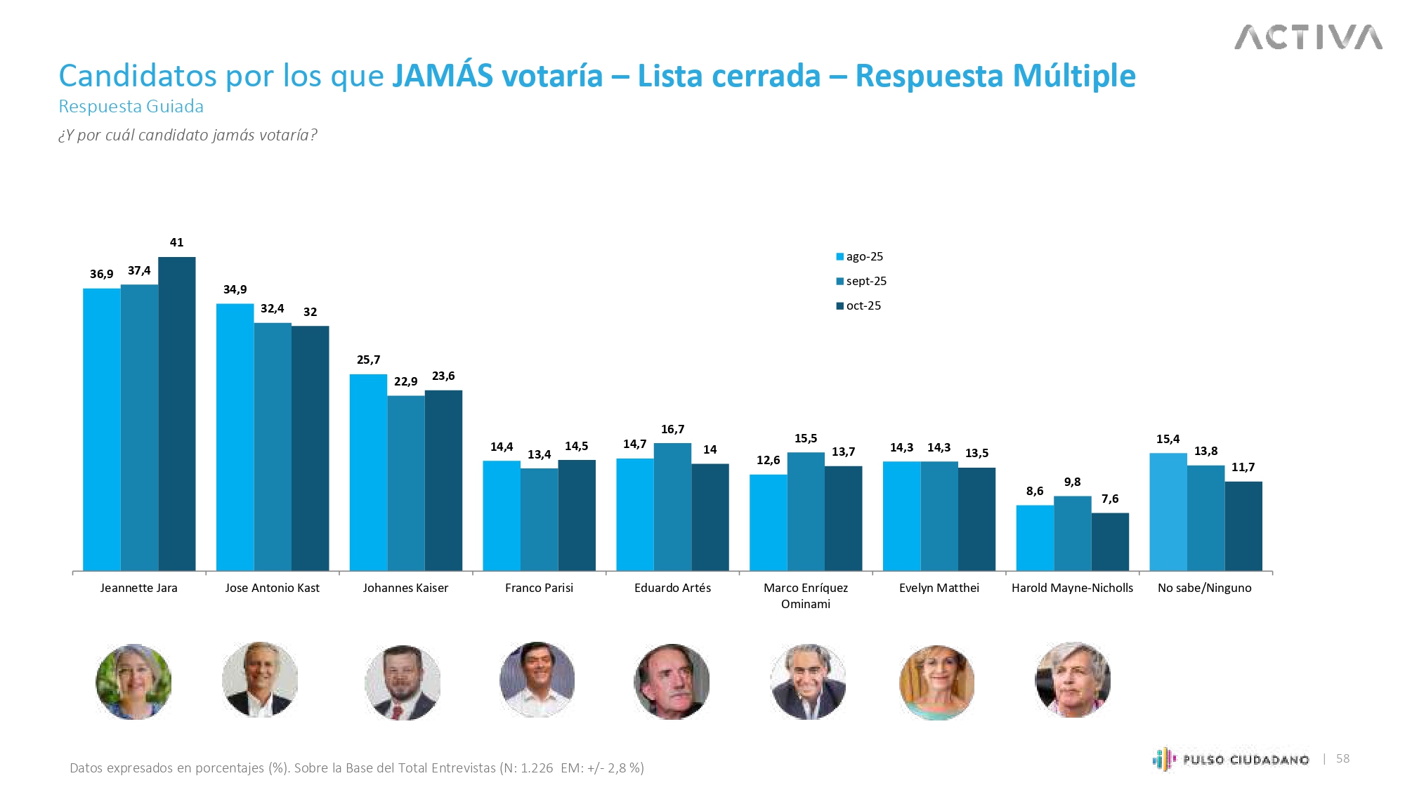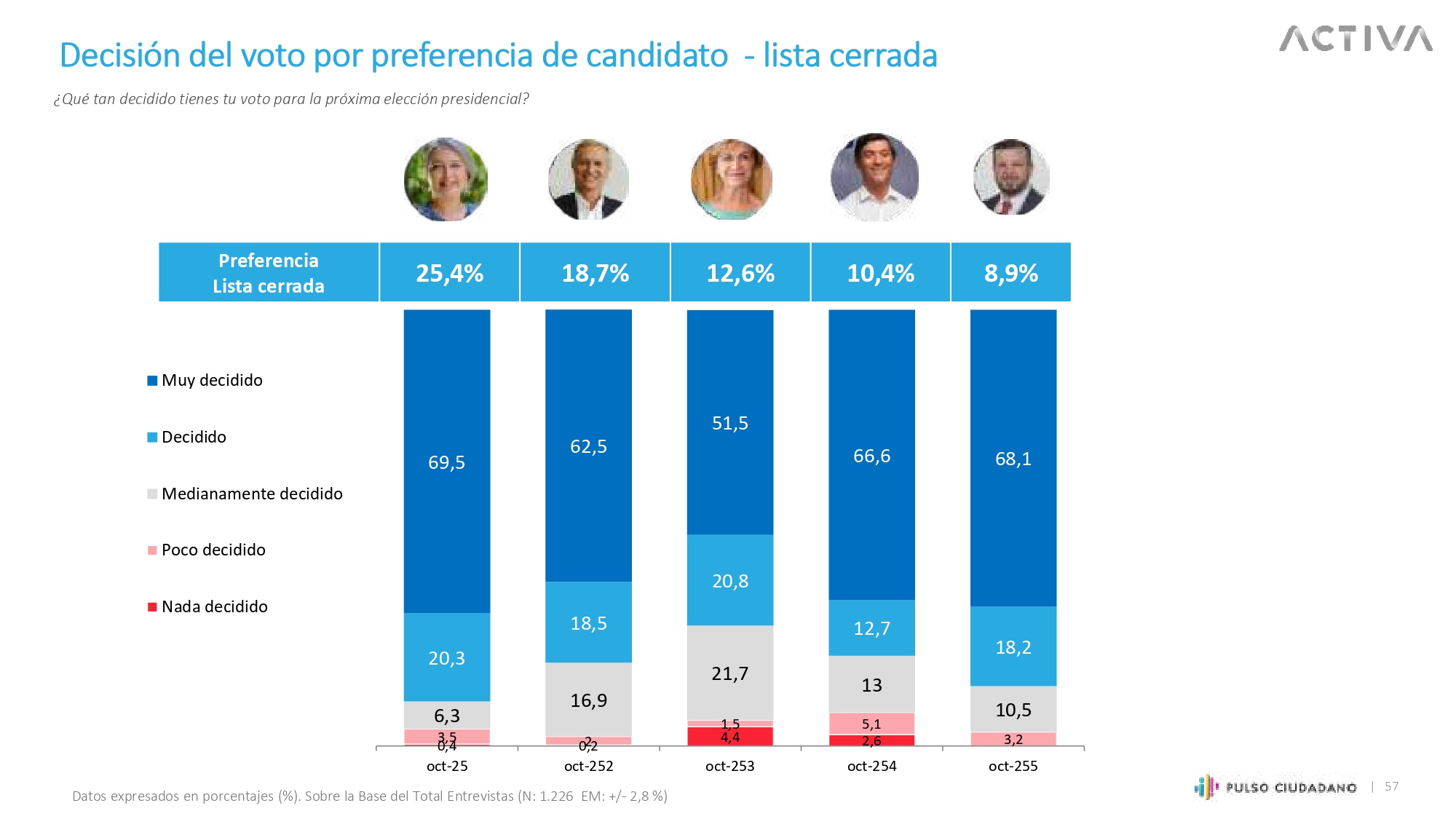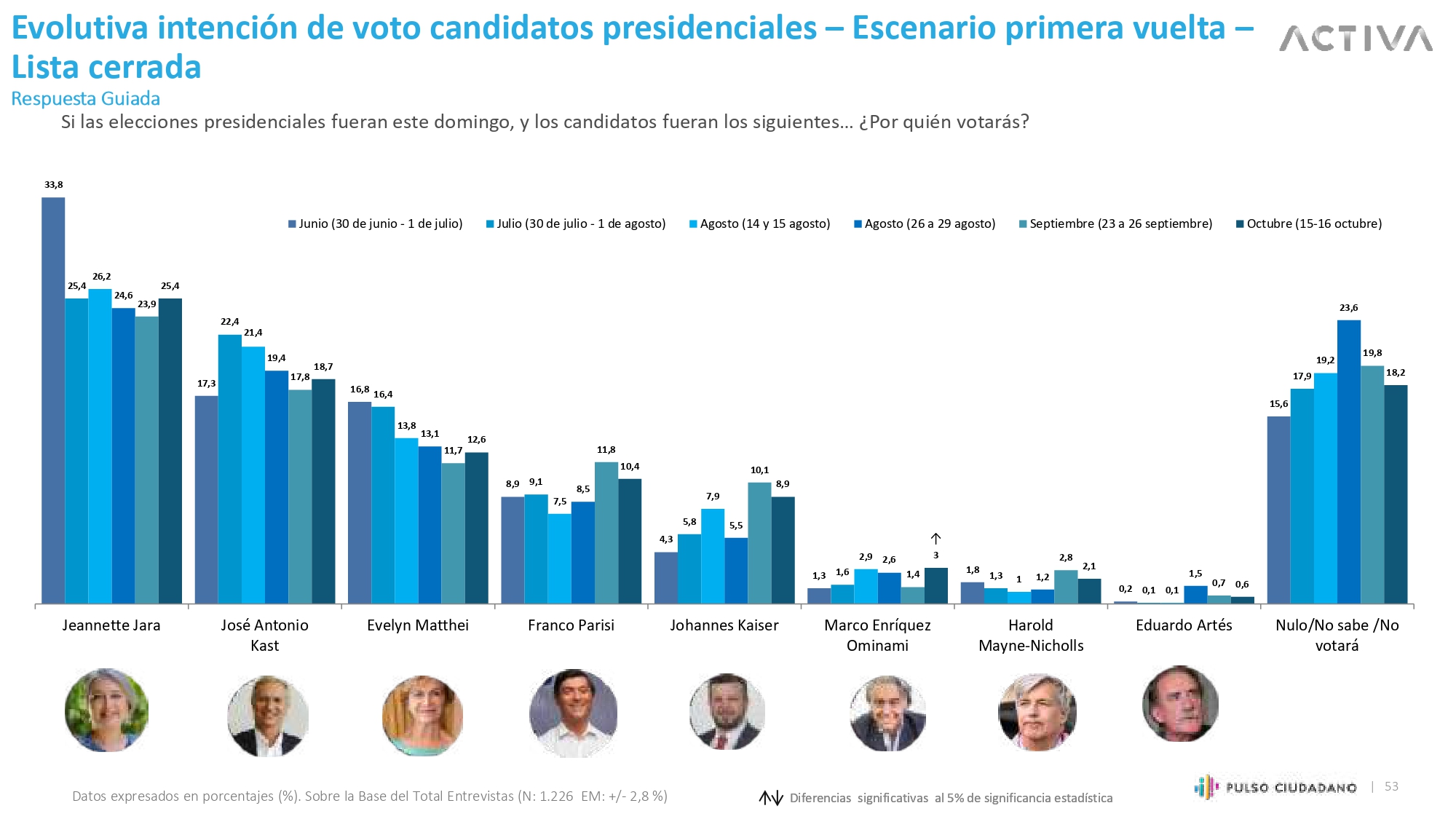 “Lo relevante es que hay tres candidatos que se están disputando el tercer lugar, quienes no presentan diferencia estadística en términos de representación”, sostuvo. Los abanderados serían Evelyn Matthei, Franco Parisi y Johannes Kaiser.
