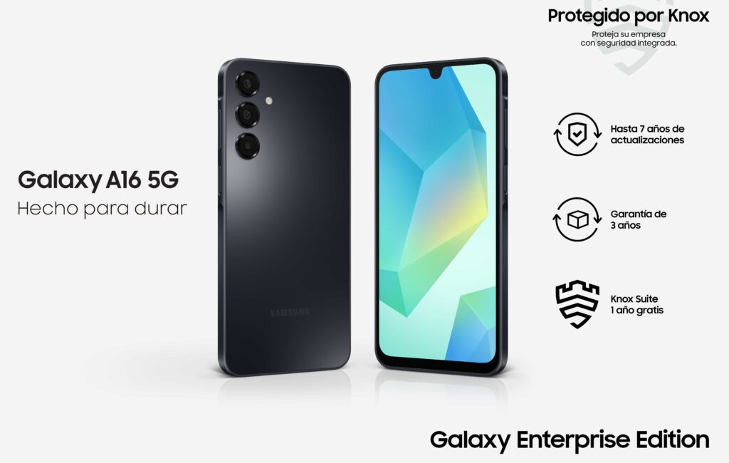 Otra opción presentada en versión para empresas fue el Galaxy A16 Enterprise Edition, un smartphone de 6,7 pulgadas, con colores y detalles nítidos para trabajar en su pantalla Super AMOLED FHD+.