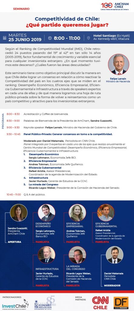 La Cámara Chilena Norteamericana de Comercio, AmCham Chile, realizará este martes 25 de junio desde las 08:00 horas el seminario anual del Comité de Competitividad, Inversiones y Negocios de AmCham Chile titulado “Competitividad de Chile: ¿Qué partido queremos jugar?”.
