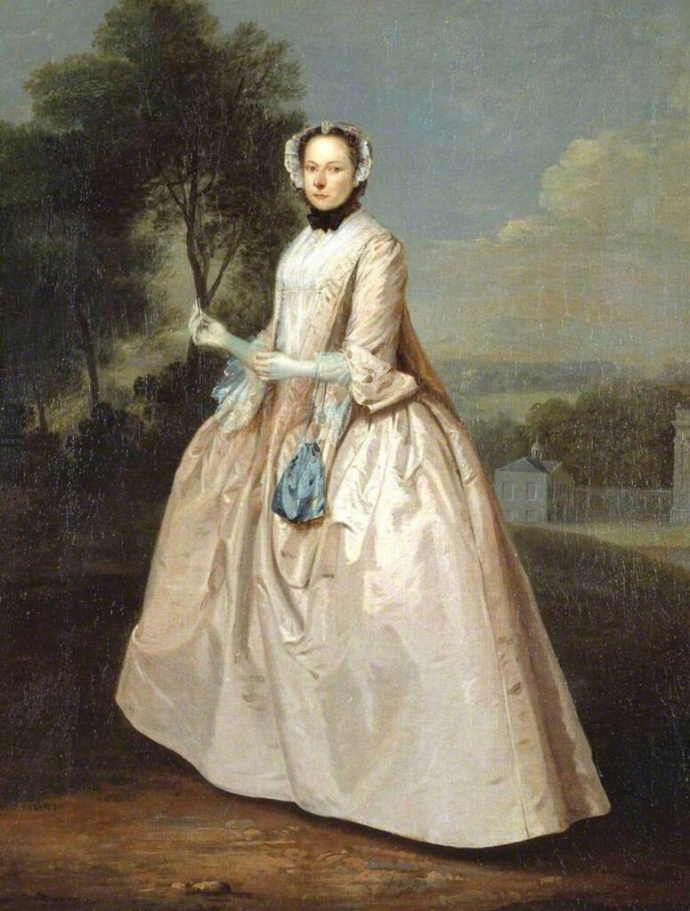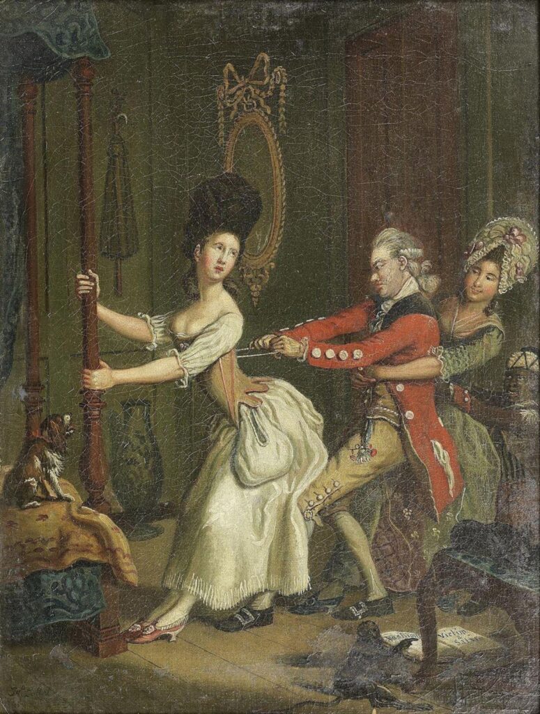 Los bolsillos de corbata de las mujeres a veces se exageraban en pinturas y grabados, o se comparaban con genitales. El artista satírico John Collet mostró este bolsillo de corbata excesivamente recargado en “Víctima de la Moda: una Sátira” de 1777. Foto de archivo de Alamy.