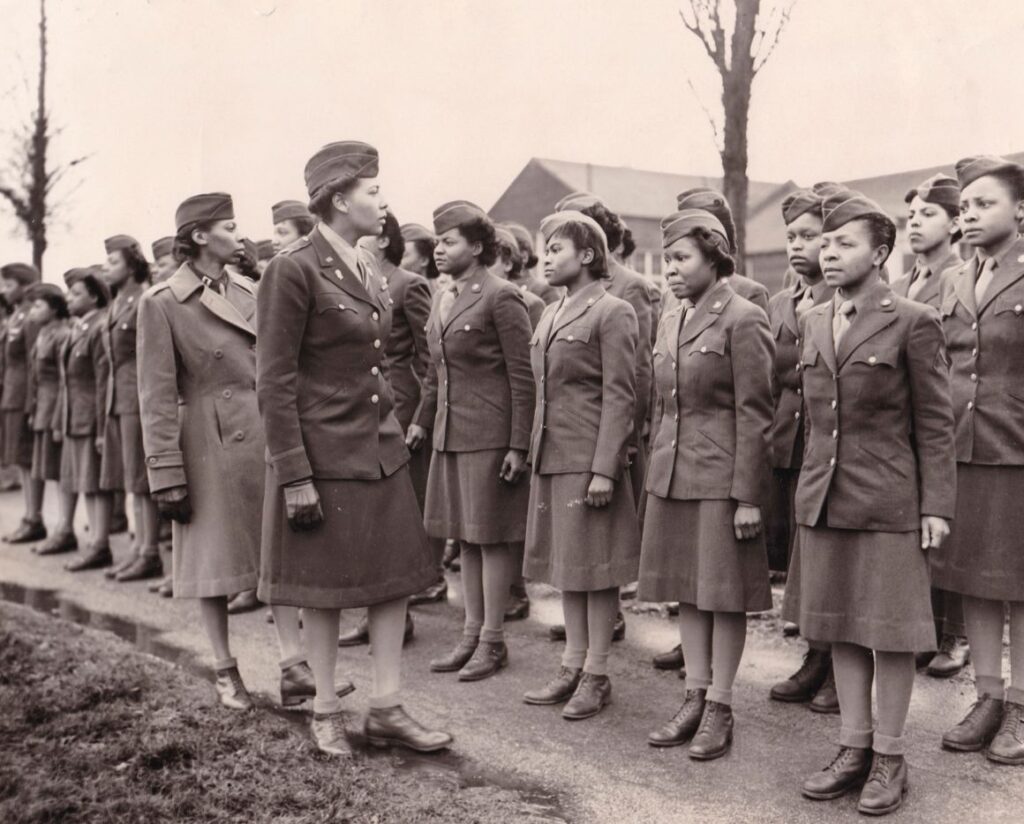 El batallón histórico compuesto exclusivamente por mujeres y negros del Cuerpo de Mujeres del Ejército en 1945. Los uniformes incluían bolsillos falsos en el pecho y un espacio de transporte mínimo. Foto del ejército de EE. UU./AP.